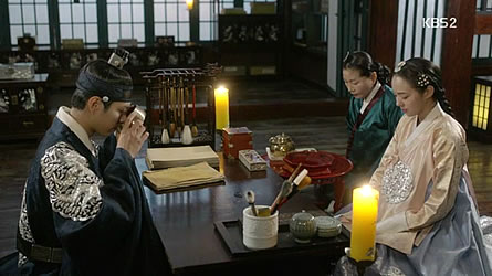 | Episode 3 recap: The Queen (Kim Yoon-sung’s aunt) slaps Ra On for insisting on bringing Consort Park’s letter to the King. But despite that, Ra On still slips the letter among the petitions sent to the King. The King’s blank reply-letter is actually written with apple vinegar, and as Byung-yeon shows Ra On, the characters appear when the letter is held near a flame. Through Ra On, the King and Consort Park are reunited. But the King is tormented by nightmares of 2,000 people dying because of him, and so he tells Yi Yeong that he will abdicate. Yi Yeong agrees to be the Crown Prince Regent, but insists that in times of difficulties, the King must act toward him just like a father would. (In a flashback, Yi Yeong remembers how the King refused to do anything despite knowing that the Queen was murdered. Now, the King says that doing nothing has been the only way to protect everyone he loves.) Ra On finally recognizes that the man she calls “Silver Spoon” is the Crown Prince. |